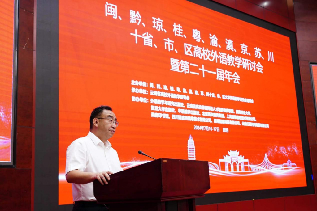 7月15日至17日,十省市区高校外语教学研讨会暨第二十一届年会在昆明世博花园酒店举行。本次研讨会围绕“强国建设,外语何为”这一主题展开,吸引了来自北京大学、南京大学、广东外语外贸大学、外语教学与研究出版社、商务印书馆、语言桥集团等国内知名高校和语言服务机构的180名专家学者参会。bwin必赢唯一官方网站校长王卫斌受邀在大会开幕式上致辞。