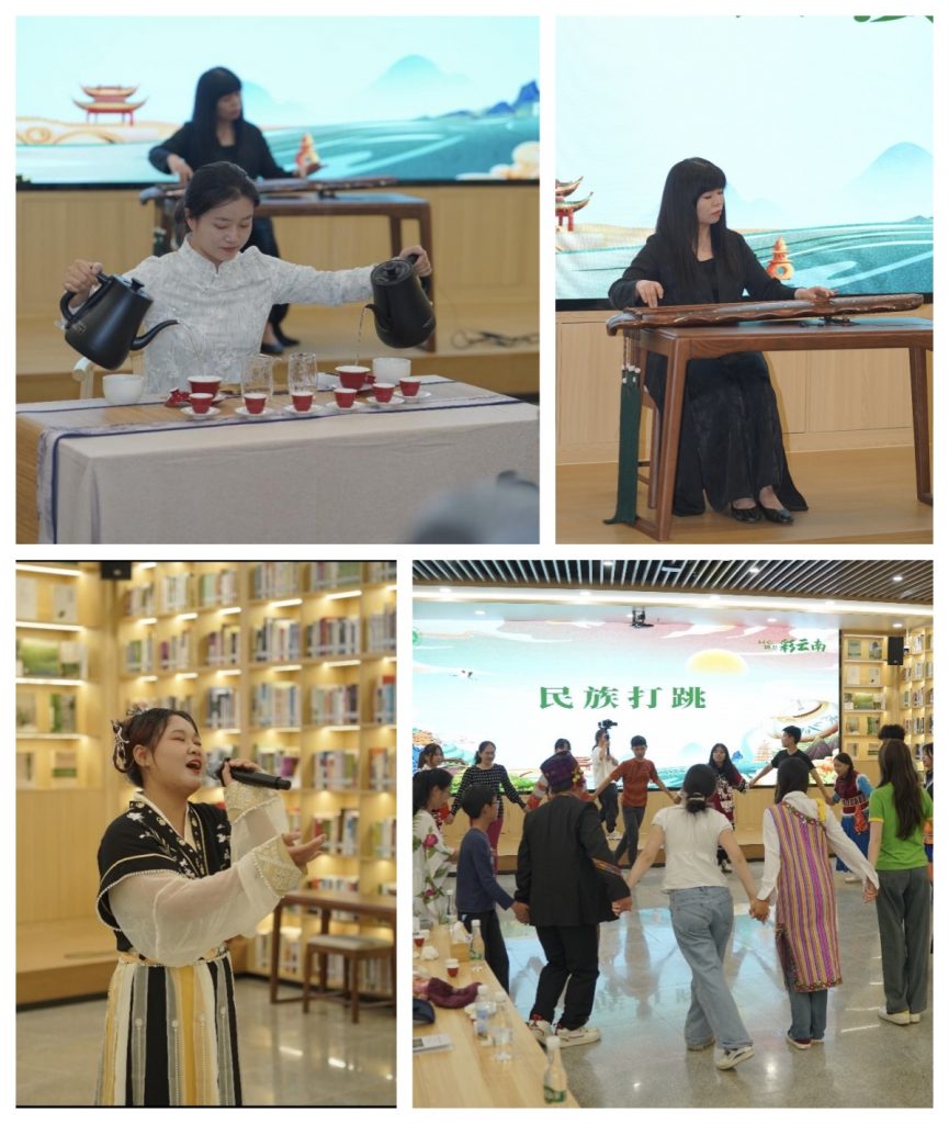 “抚之平心而静气,听者宁静而致远”,外国语学院教师曹晓萌进行古琴演奏,伴随古琴悠韵,古茶树研究中心两位研究生带来茶艺表演,华裔青少年们频频举起相机,记录下这充满韵味的美好瞬间,身着汉服的大学生们献上刚泡好的茶饮,来宾们一起品尝甘甜香醇的金色茶汤,沉浸在安静祥和的氛围里。活动在“但愿人长久,千里共婵娟”的歌声中渐入高潮。并在我校大学生与华裔青少年手拉手的《三跺脚》打跳中落下帷幕。
