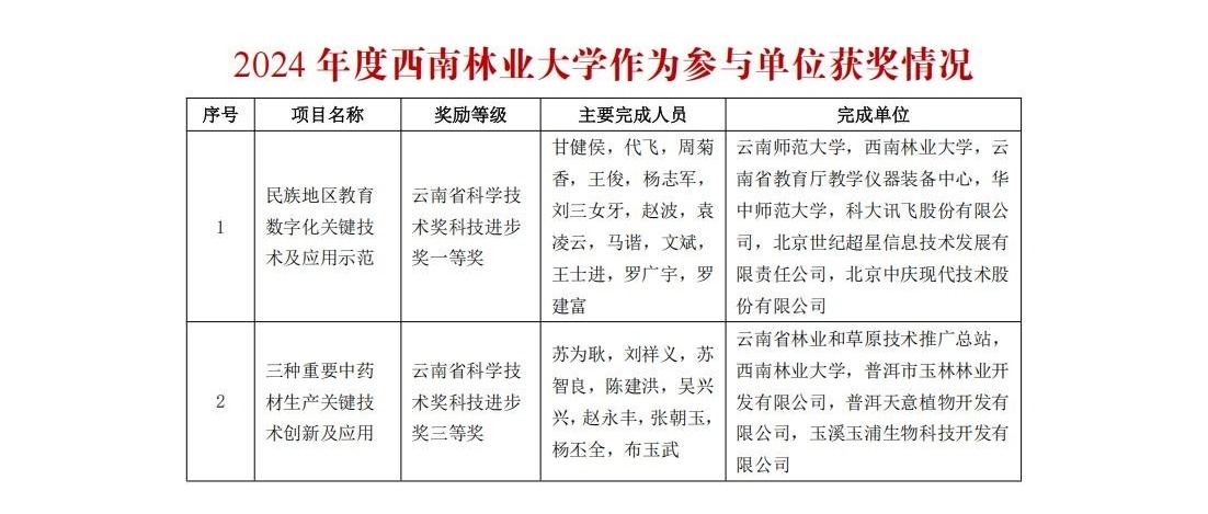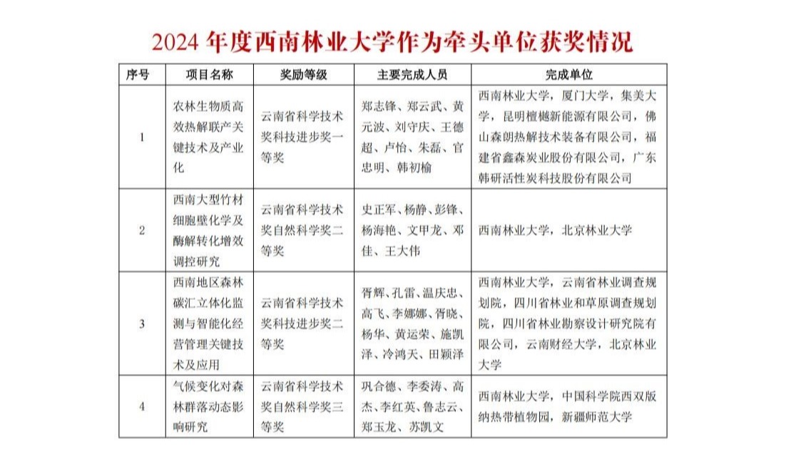 学校作为牵头单位获奖4项,其中,《农林生物质高效热解联产关键技术及产业化》荣获云南省科学技术奖科技进步奖一等奖;《西南大型竹材细胞壁化学及酶解转化增效调控研究》荣获云南省科学技术奖自然科学奖二等奖;《西南地区森林碳汇立体化监测与智能化经营管理关键技术及应用》荣获云南省科学技术奖科技进步奖二等奖;《气候变化对森林群落动态影响研究》荣获云南省科学技术奖自然科学奖三等奖。
