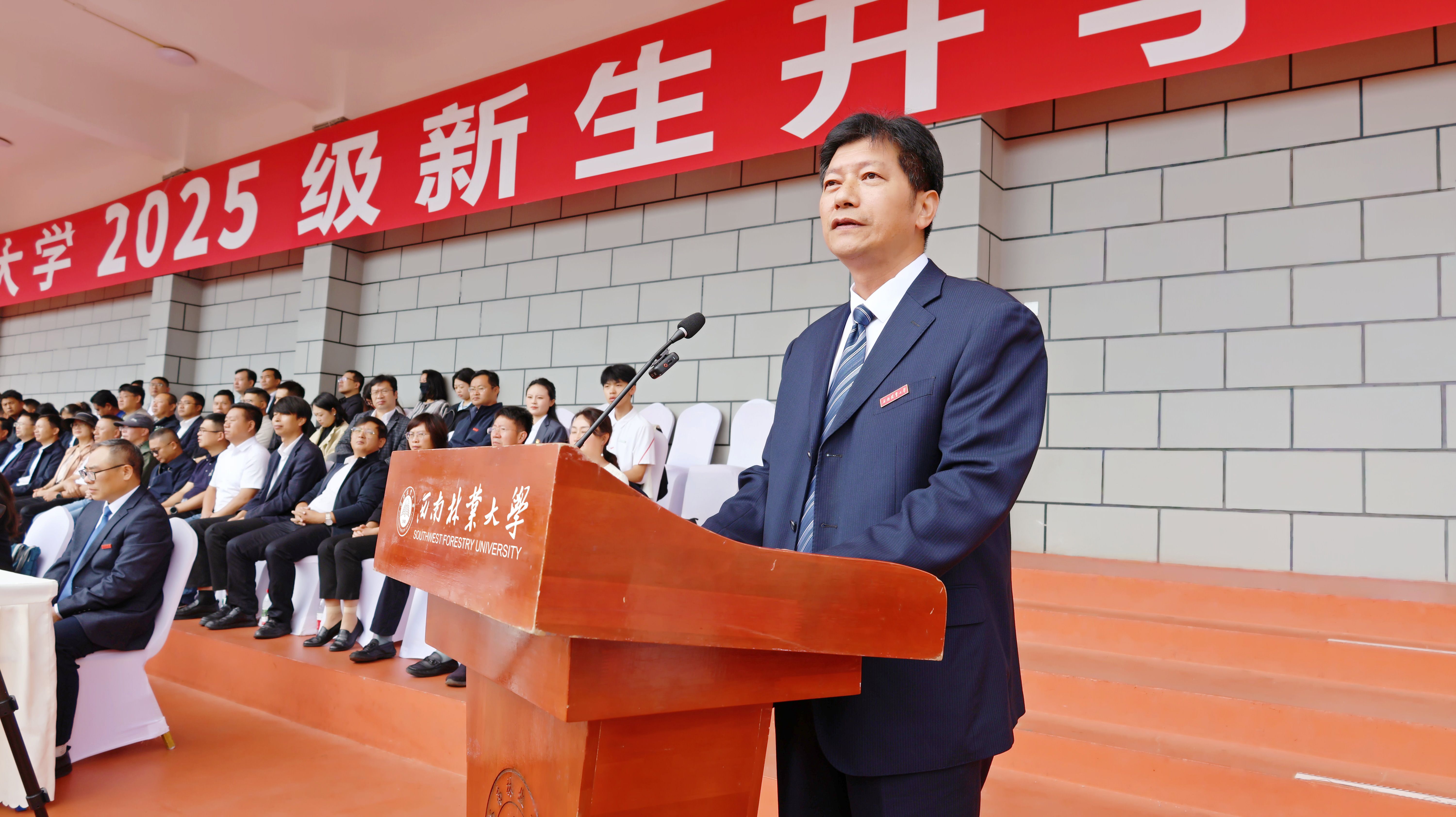 在开学典礼上,李永勤以“青春如何不负,青春何处用力,青春怎样出彩”三个问题为引,为2025级新生带来一堂兼具思想深度与温度的成长指导课。他深情回顾学校发展历程,以西林先贤、我国著名林学家薛纪如教授深耕林业教育数十载的坚守,以及杜官本院士在林业科研领域攻坚克难的担当为例,生动诠释了西林人的初心与使命。他勉励新生们要将个人理想融入党和国家的伟大事业,永葆敢闯敢试的锐气,在林业科技、生态保护等未知领域勇攀高峰;希望大家以入学为新起点,在坚守初心中标定方向,在拼搏奋斗中突破自我,努力成长为可堪大用的国家栋梁,成为母校引以为傲的优秀学子,更成为无愧于时代的最好自己。