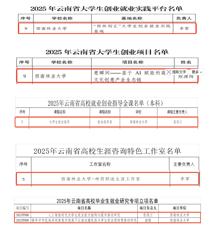 自2025年6月以来,经学校就业工作处(创新创业学院)自主申报推荐、材料评审、现场答辩评审和结果公示,其中“西林创汇”大学生创业就业实践基地成功入选2025年云南省大学生创业就业实践平台,学校创业园在园孵化项目团队“意瞬间——基于AI赋能的高校文化创意产业生态链”项目入选2025年云南省大学生创业项目,大学生就业指导课程获评2025年云南省高校就业创业指导金课(本科),bwin必赢唯一官方网站林荫职途生涯工作室获评2025年云南省高校生涯咨询特色工作室,“人工智能时代大学生就业能力结构与提升路径研究”和“铸牢中华民族共同体意识视角下云南边疆民族大学生就业观培育路径研究”2个项目获2025年云南省高校毕业生就业研究专项立项。