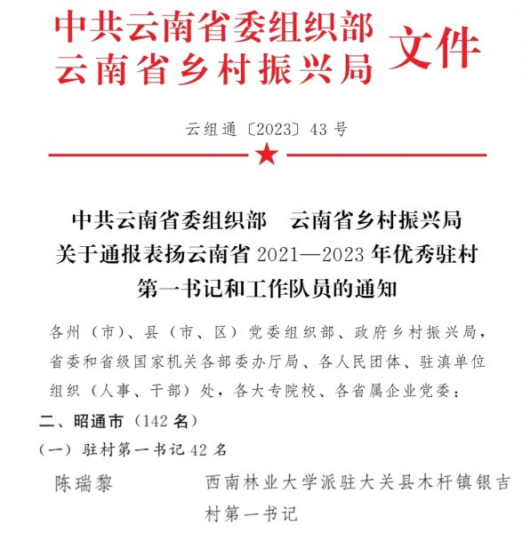 近日,中共云南省委组织部、云南省乡村振兴局发出通知,通报表扬云南省2021—2023年优秀驻村第一书记和工作队员,我校派驻大关县木杆镇银吉村第一书记陈瑞黎荣获“优秀驻村第一书记”荣誉称号被通报表扬。