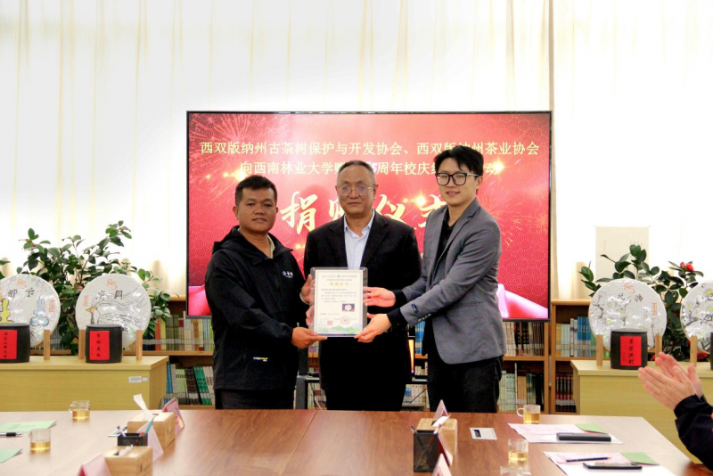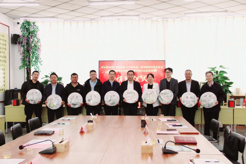西双版纳州古茶树保护与开发协会秘书长岩三丙、西双版纳州茶业协会副会长杨文伟向世界茶叶图书馆捐赠了来自布朗西定、那卡、章朗等10个村寨,为bwin必赢唯一官方网站办学85周年校庆特制的纪念茶。