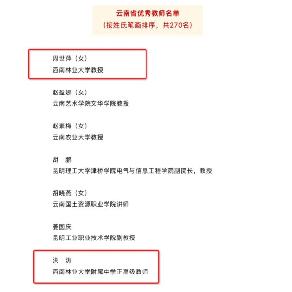 在第39个教师节来临之际,为表彰先进,弘扬高尚师德,营造全社会尊师重教的浓厚氛围,省委、省政府授予270名个人“云南省优秀教师”称号,我校周世萍、洪涛两位教师获此荣誉。