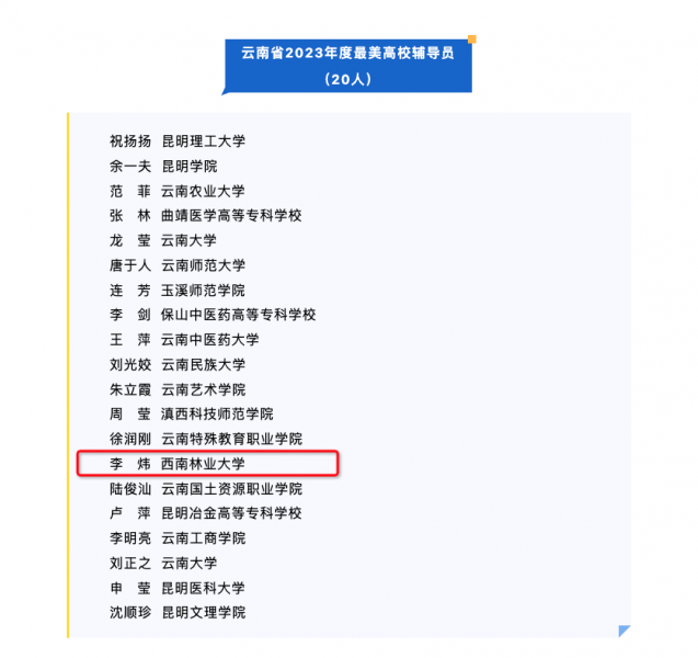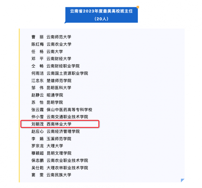 近日,中共云南省委宣传部、省教育厅公布了云南省2023年最美高校辅导员和最美高校班主任推选结果。经过学校推荐、资格审查、专家评审、公示等环节,我校林学院李炜老师荣获“云南省最美高校辅导员”荣誉称号、生物多样性保护学院刘朝茂老师荣获“云南省最美班主任”荣誉称号。