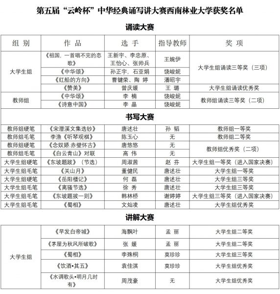 我校语委、团委、艺术博物馆以及各学院部门积极组织师生参加云南省教育厅、省语委启动的云南省第五届“云岭杯”中华经典诵写讲大赛系列活动,共计22项作品参加了“书香彩云南”经典诵读大赛、“墨香彩云南”汉字书写大赛、“诗意彩云南”诗词讲解大赛三个赛项。经省级评选,共荣获一等奖3项、二等奖3项、三等奖9项,优秀奖6项。其中周淑茜和韩林桥两名同学入围教育部国家语委主办的第五届“笔墨中国”汉字书写大赛决赛。
