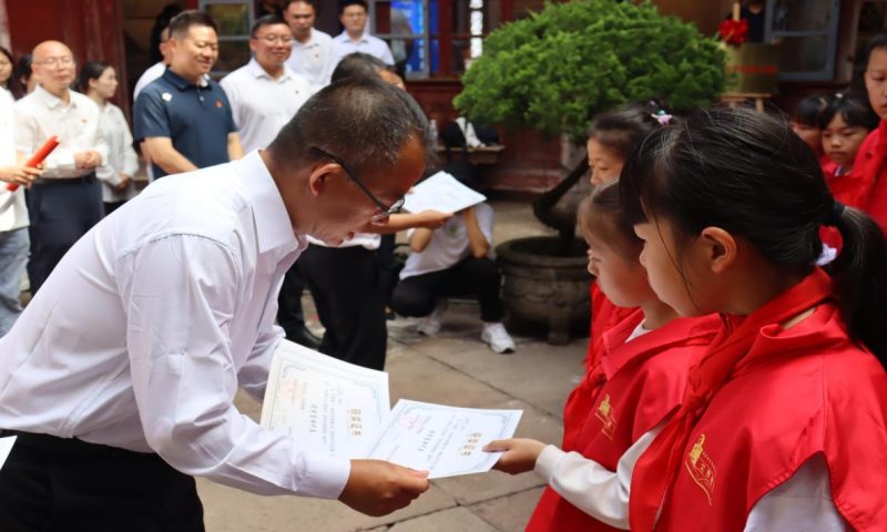 签约仪式结束后,红领巾小小宣讲员向参会嘉宾讲解艾思奇的生平事迹。