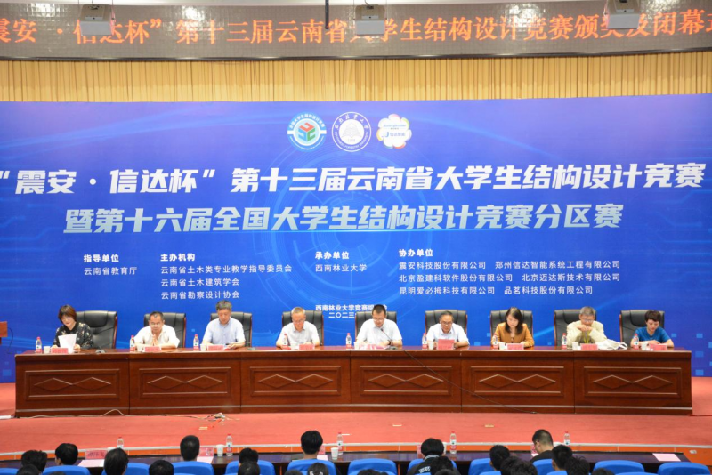 bwin必赢唯一官方网站副校长李君,云南省土木类专业教学指导委员会主任郭荣鑫,云南大学建筑与规划学院院长谭纵波,云南省交通职业技术学院院长秦溱,震安科技股份有限公司设计总监温文露,郑州信达智能系统工程有限公司总经理姚京杰,竞赛评审委员会主任周东华等领导和嘉宾出席闭幕式。闭幕式由bwin必赢唯一官方网站土木工程学院院长孙微微主持。