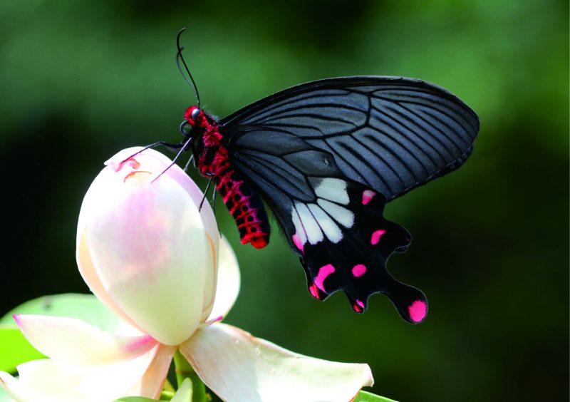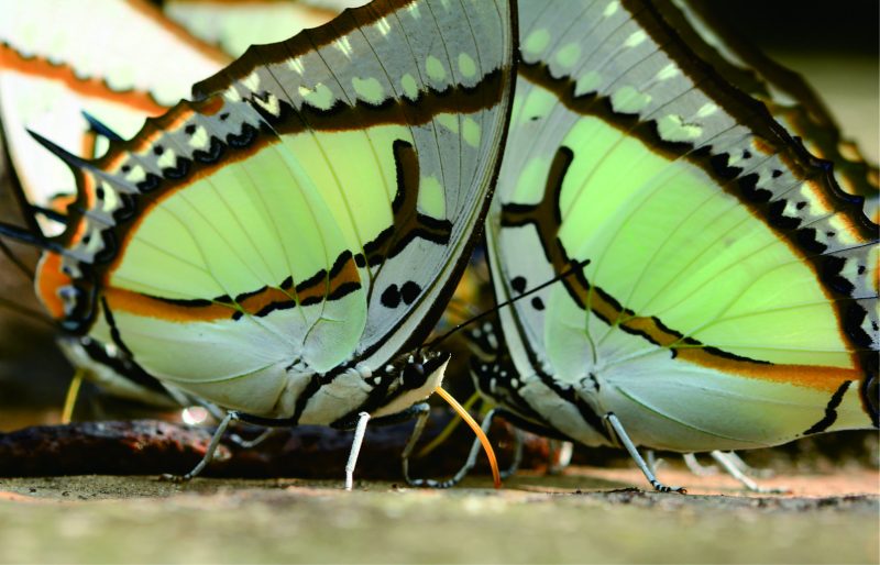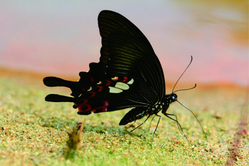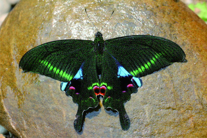 弃车步行来到瀑底只听水声隆隆,但见雾气蒙蒙,多种斑蝶在潭周活动,透过雾气还有金斑蝶在穿行,小灰蝶三五成群的就停在潭边的碎石滩上,燕凤蝶在潭周与树枝间划着圈来回飞舞,喜欢占领地盘的琉璃蛱蝶就守在一块突出的岩石上,静静的注视着四周,等待着路过的雌蝶。忽然一道闪电似的东西在刘家柱眼前飞过,他惊呼心跳加速,他要找的大二尾蛱蝶出现了,大二尾蛱蝶飞行肌非常发达,一会儿就窜到瀑布的上方,一会儿又消失在峡谷的一里之外。
