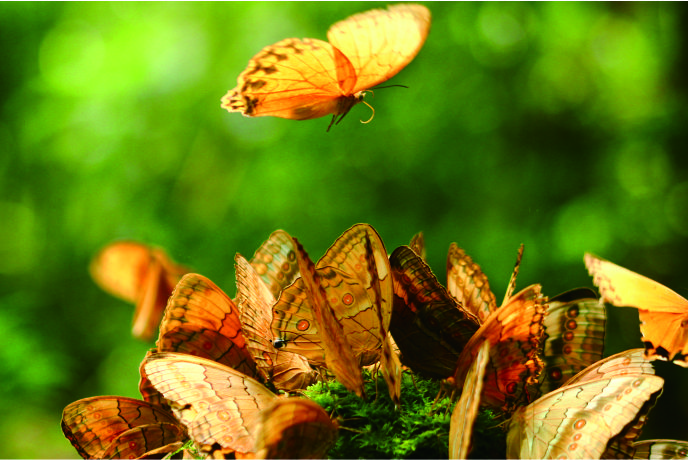 步移景变,黄褐色的箭环蝶足有上百只聚集在那里,他不敢相信自己的眼睛看到的是蝴蝶,它们在那里不知已经呆了多长时间了,它们紧紧的挤在一块几乎是一动不动,一会儿又飞来一只聚在一起,使这个部落越来越大,偶尔看到被挤得受不住的蝴蝶扇动一下翅膀,它往前一挤,又停止不动了。正当他看得入迷,忽见一只大鸟带着风声展开双翅划过了这群蝴蝶的上空,在离蝴蝶群不远的小溪边抓捕起一条绿色的小蛇,转眼间就消失在林海之中了。被惊动的蝴蝶轰的一下像天女散花飞了起来……那一次的美丽邂逅,注定他要和这群黄褐色的蝴蝶仙子结缘。