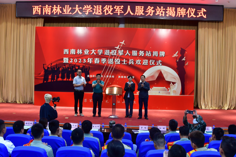 为把学习贯彻习近平新时代中国特色社会主义思想主题教育引向深入,6月15日,学校退役军人服务站揭牌仪式在图书馆大报告厅举行。副校长狄光智,昆明市退役军人服务中心主任张文玉,盘龙区退役军人事务局党组书记、局长罗刚等出席。盘龙区2023年春季退役军人,退役复学大学生代表、各学院辅导员、武装部全体工作人员、学生代表等共400余人参加活动。活动由学生处(学生工作部、武装部)负责人主持。