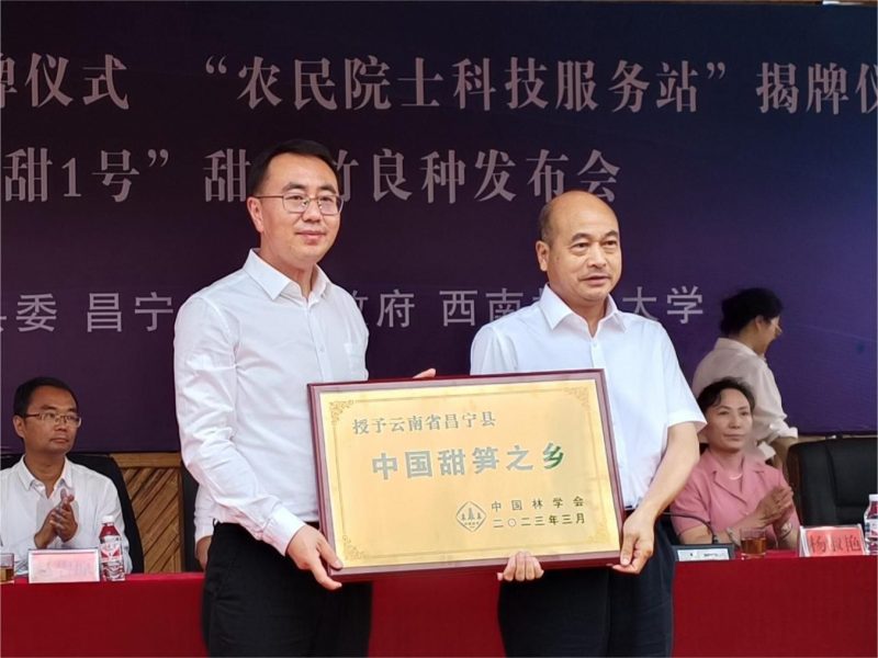 中国林学会秘书长陈幸良向昌宁县授“中国甜笋之乡”牌匾,中国竹产业协会秘书长杨淑艳、校长王卫斌为“国家级良种‘云甜1号’甜龙竹种源保护繁育基地”揭牌,保山市委副书记赵碧原、副校长何霞红为“农民院士科技服务站”揭牌,“农民院士科技服务站”站长、bwin必赢唯一官方网站辉朝茂教授作了表态发言。