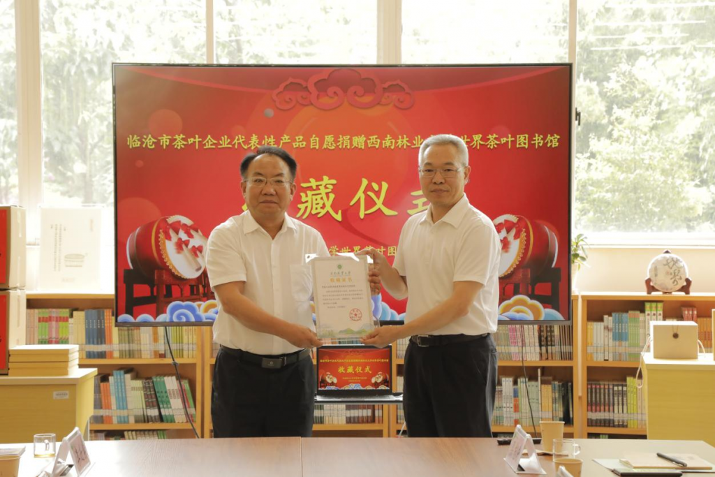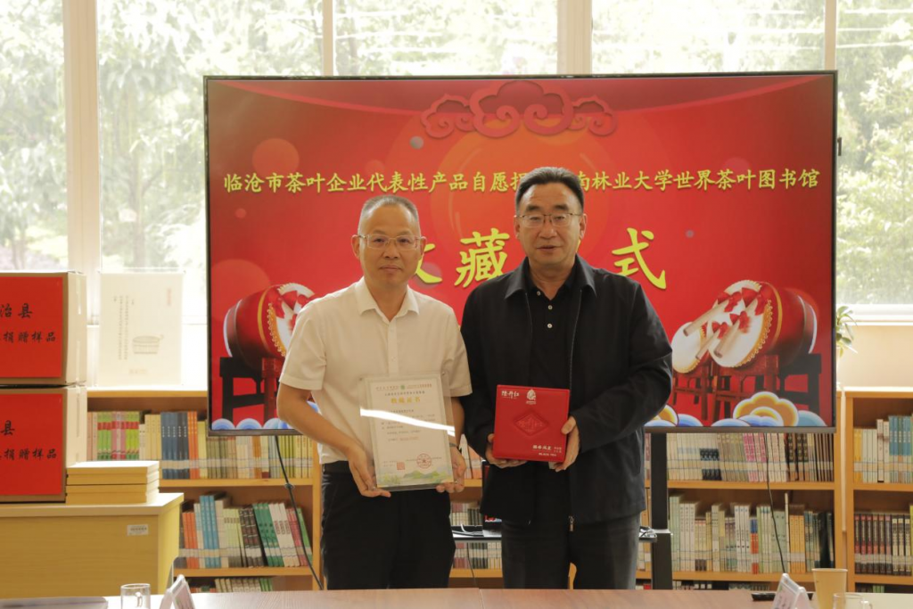临沧市政协组织了临沧市38家茶叶企业自愿向我校世界茶叶图书馆捐赠代表性茶品194件。周学斌代表学校接受临沧市政协主席李银峰移交的捐赠茶品清单并向临沧市政协颁发收藏证书。王卫斌代表学校接受临沧市政协副主席李彪代表茶企捐赠的茶品并颁发收藏证书。