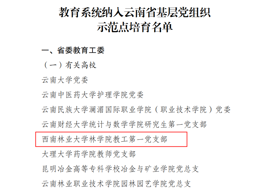 近日,省委组织部印发了全省基层党组织示范点培育名单,全省高校共有25个基层党组织入选,我校林学院教工第一党支部位列其中。