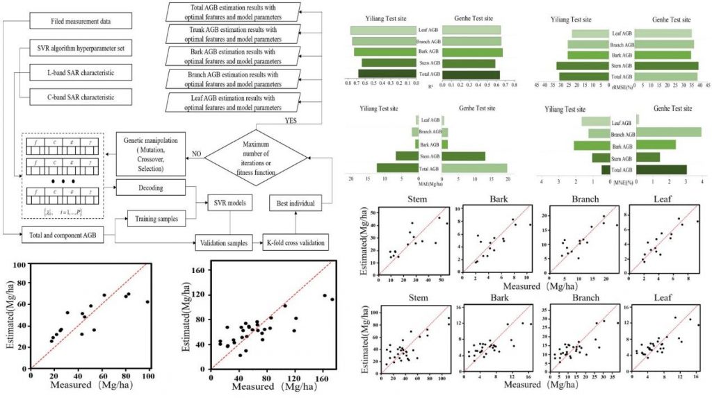 精确的森林生物量反演是实现“碳达峰、碳中和”目标的重要前提,估算森林AGB对生态系统管理至关重要。本研究探索了以C-和L-波段的全极化SAR数据极化和后向散射系数作为遥感特征对不同研究区的森林总AGB和地上分量(干、皮、枝、叶)AGB的反演。研究基于GA-SVR模型进行了遥感特征和超参数的优选,并对森林地上分量生物量和总AGB进行建模。研究探索了不同频率的极化SAR特征对森林分量生物量的敏感性,验证了团队提出的GA-SVR模型在森林AGB反演中推广应用的鲁棒性,为森林AGB遥感反演中存在的饱和瓶颈问题提供了解决思路。(来源:林学院(亚太林学院)/图:史建敏/文:王梦金/审核:王昌命/初审:李颖/复审:史桓恺/终审:张武先/责任编辑:史桓恺)