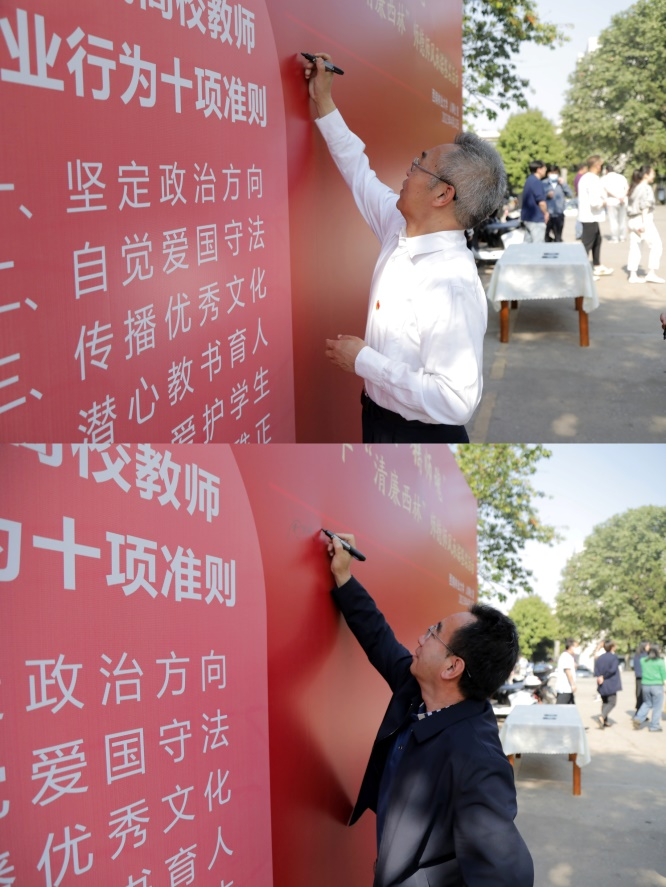 随后,各学院老师在承诺墙上郑重签字。一个个名字犹如一声声为党育人、为国育才的承诺,把西林教师树立高尚师德、清正廉洁从教的决心和信心镌刻在春的画卷上。