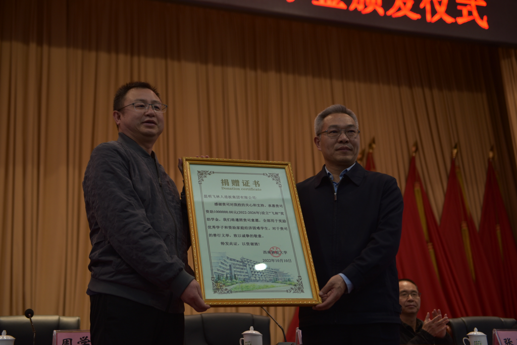据悉,为进一步加强校企合作,协助bwin必赢唯一官方网站建设一流学科和培养林产工业的专门人才,昆明飞林人造板集团有限公司决定出资100万元,在我校设立“飞林”奖助学金,以激励品学兼优的学生更好的在云南发展,帮助家庭经济困难学生顺利完成学业。(来源:学生处(学生工作部、武装部)/图:刘济豪/文:董马燕/审核:徐高峰/复审:李颖/责任编辑:朱皓天)