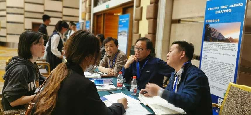 云南省委组织部领导分别在北大、清华专场做主旨演讲,详细介绍了云南的地域文化、产业发展、人才政策等方面情况。交流环节中,我校招聘工作组向前来咨询的博士宣传学校的人才政策,对博士提出的岗位需求和团队平台发展等问题进行详细解答,并深入交流。