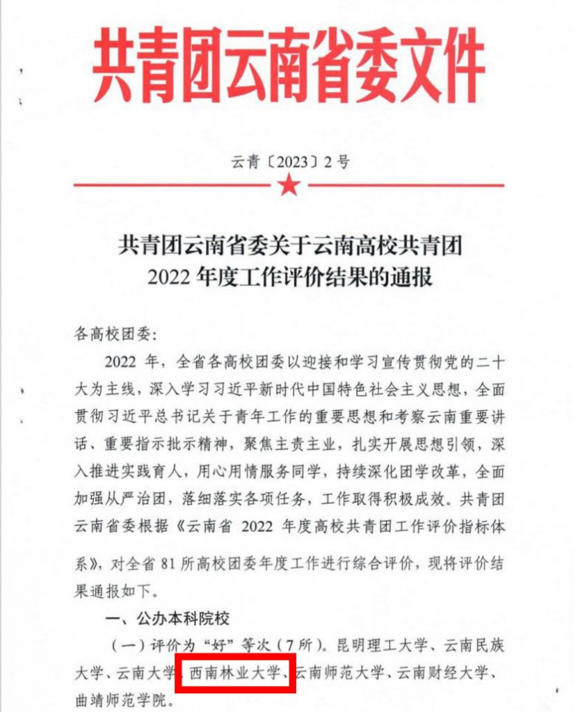 近日,共青团云南省委印发《关于云南高校共青团2022年度工作评价结果的通报》,我校共青团工作在全省81所高校中获评“好”等次。