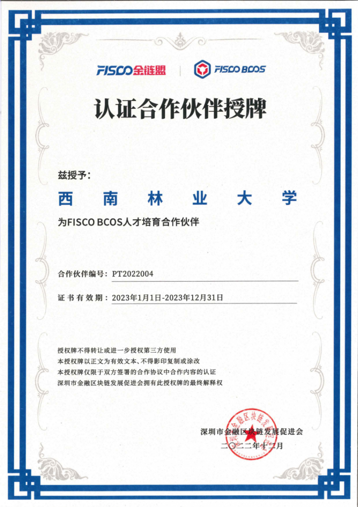 近日,由深圳市地方金融监督管理局指导,微众银行、深圳市金融区块链发展促进会(金链盟)联合举办的“2022产业区块链年度峰会暨FISCO BCOS五周年生态大会”在深圳隆重召开。大会举行了2022年度FISCO BCOS合作伙伴授牌仪式。我校梁志宏教授研究团队,以2020年省科技厅重大专项“服务于重点行业的区块链关键技术研究与应用示范”(项目编号:202002AD080002)建设为依托,凭借共建FISCO BCOS人才培育体系和在区块链教育所取得的丰硕成果,正式成为2022年度FISCO BCOS人才培育合作伙伴。