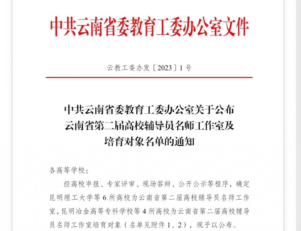 1月29日,云南省委教育工委办公室发布《中共云南省委教育工委办公室关于公布云南省第二届高校辅导员名师工作室及培育对象名单的通知》,此次共确定6所高校为云南省第二届高校辅导员名师工作室,4所高校为云南省第二届高校辅导员名师工作室培育对象。我校邓志华老师担任负责人的辅导员名师工作室确定为云南省第二届高校辅导员名师工作室。