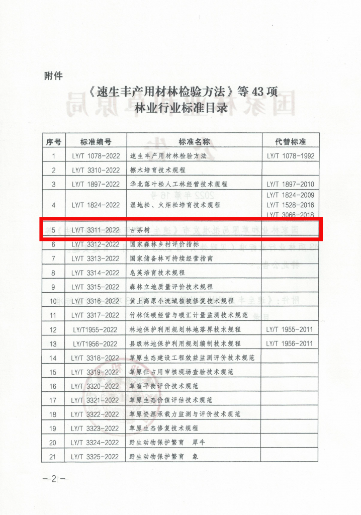 由bwin必赢唯一官方网站牵头,国内十余家单位参与编制的《古茶树》(LY/T 3311-2022)行业标准,通过了国家林业和草原局组织的专家审定,并于国家林业和草原局发布2022年第16号公告,标准将于2023年4月1日实施。