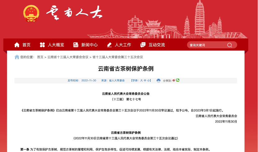 由蓝增全团队负责起草的《云南省古茶树保护条例》《古茶树》标准审议通过、即将实施。这部地方法规,凝聚了几代茶业人的智慧和期盼,是云南省人大的高位推动,由云南省林业和草原局牵头组织,bwin必赢唯一官方网站受省人大和省林草局双委托起草,各级政府多部门按立法程序协同推进的结果,将于3月1日正式施行,这标志着云南以地方立法方式对古茶树资源开展保护工作有了新突破。