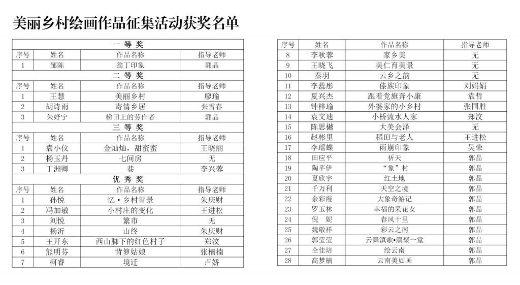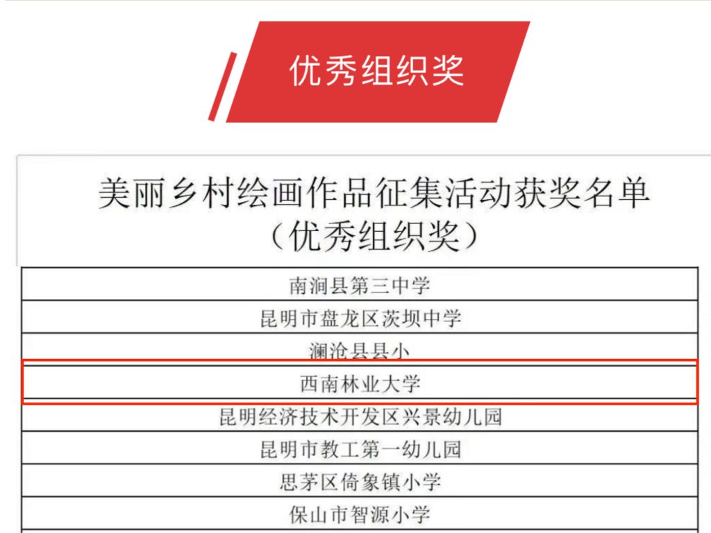 近日,由云南省农业农村厅、云南省教育厅、云南省文明办、云南省乡村振兴局、中国美术学院等部门联合主办的全省大中小学幼儿园美丽乡村绘画作品征集活动获奖名单公布,我校荣获“云南省美丽乡村绘画作品征集活动优秀组织奖”。