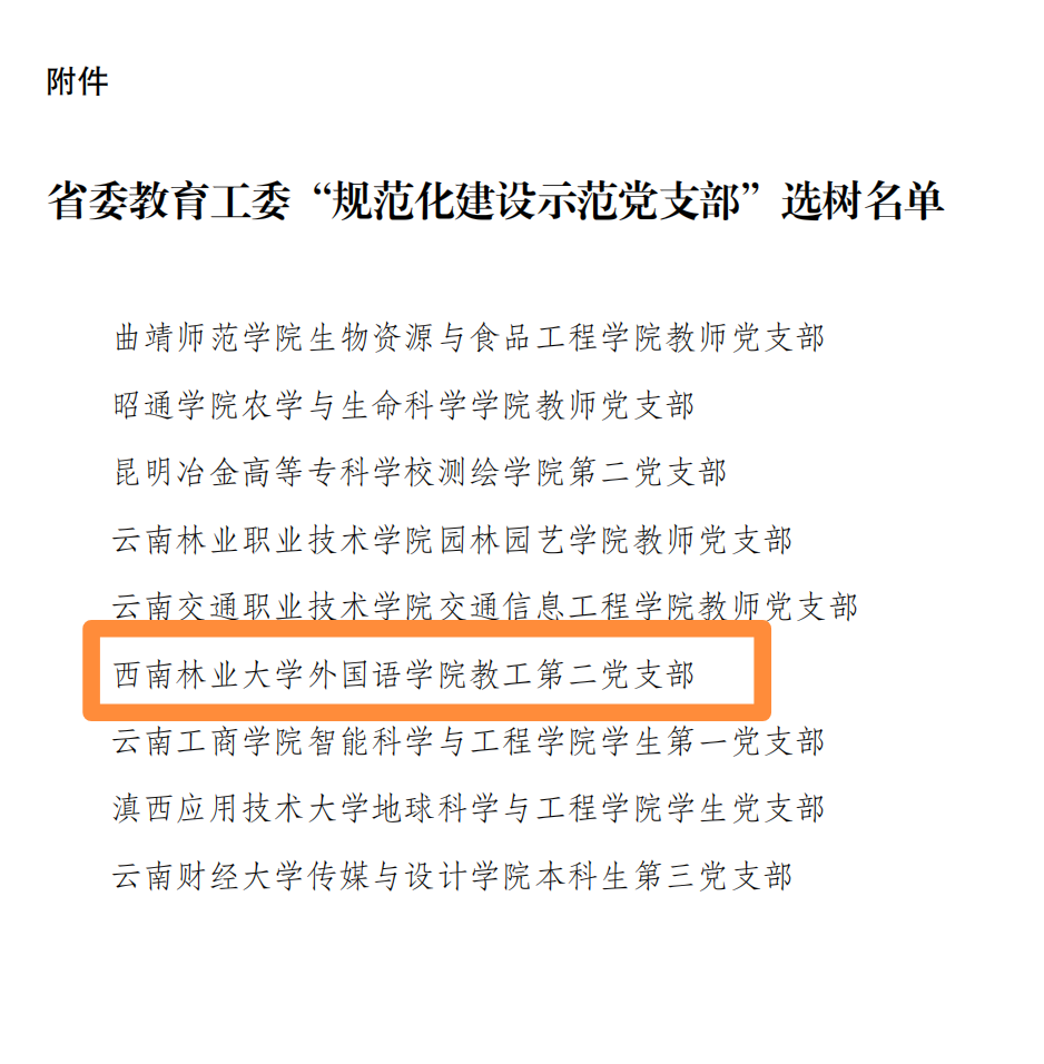 11月22日,省委教育工委公布了“规范化建设示范党支部”选树名单,我校外国语学院教工第二党支部获此次选树的荣誉称号,这是我校第二次获此称号。
