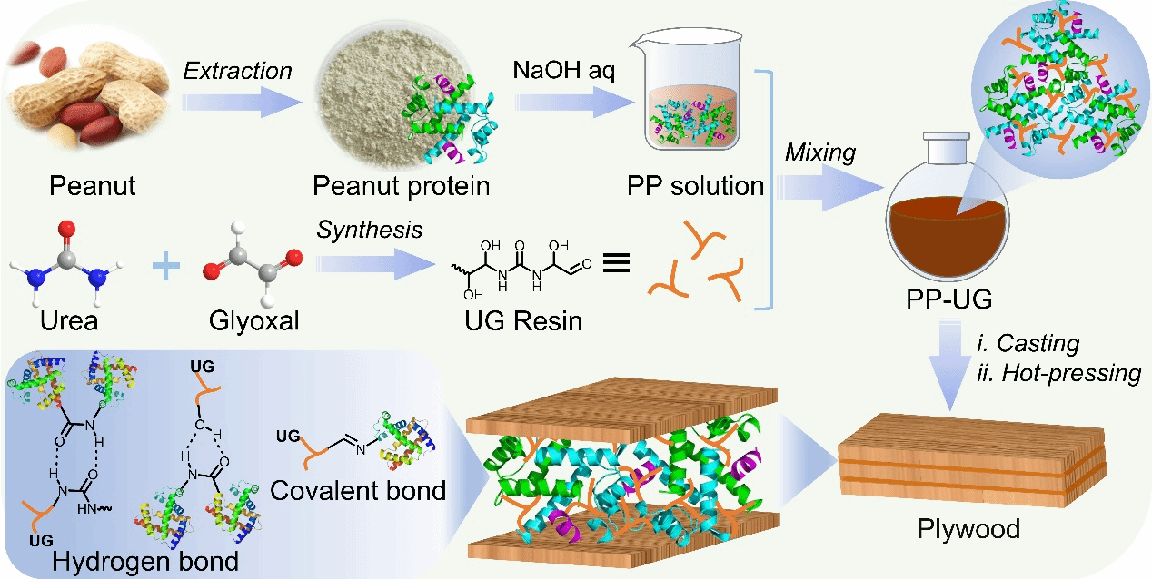 该研究成果具有重要的理论和应用价值:(1)该胶黏剂环保性能优异,解决了传统胶黏剂的甲醛释放问题;(2)制备工艺简单,易于工业化生产;(3)为农林废弃物花生粕的高值化利用开辟了新途径。花生粕是花生仁在高温提取花生油后产生的副产物,由于其中的黄曲霉毒素含量经常超过监管标准而被废弃。中国每年约产生400万吨花生粕,而花生粕中蛋白质含量较高,对其进行开发利用能实现废弃资源地变废为宝。