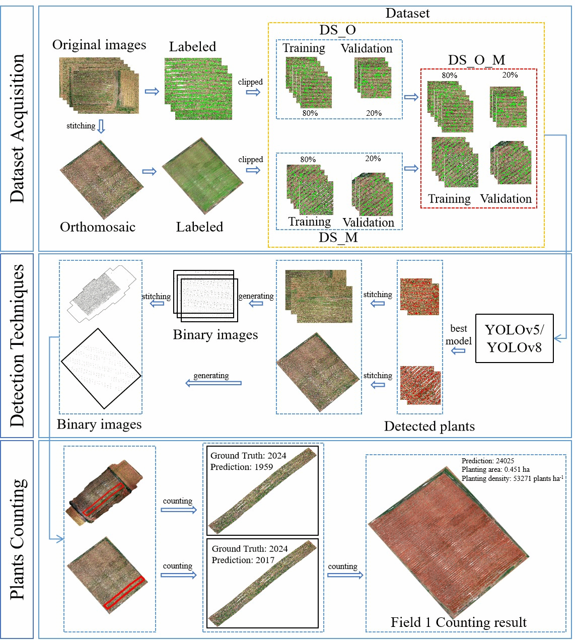 魔芋(Amorphophallus konjac)是我国西南地区重要的特色经济作物,其富含的葡甘露聚糖具有显著的保健价值。然而,传统人工计数方式效率低下、误差率高,难以满足规模化种植需求。针对这一难题,研究团队创新性地采用无人机RGB影像结合深度学习算法,构建了一套非侵入式、高精度的魔芋植株智能监测系统。研究对比分析了无人机原始RGB影像、正射影像及融合数据对识别效果的影响,发现多源数据融合策略可显著提升识别准确率,此外,团队在YOLOv5模型中引入注意力机制,进一步优化了检测性能。该研究不仅为魔芋种植的精准监测与产量预测提供了可靠的技术方案,也为其他作物智能识别研究提供了重要参考。