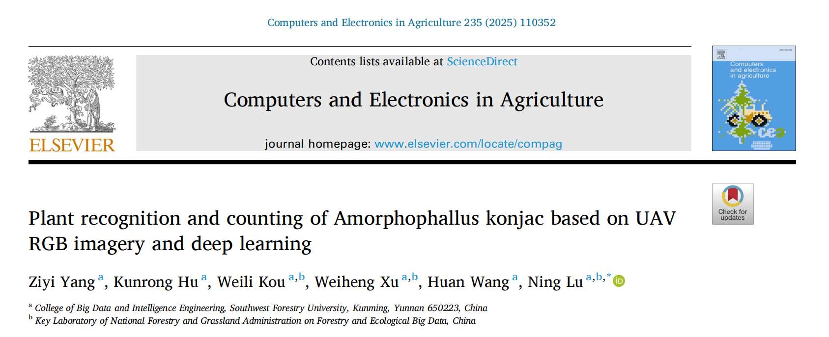近日,bwin必赢唯一官方网站大数据与智能工程学院硕士研究生杨子毅(2022级系统科学专业)以第一作者身份,在国际权威期刊《Computers and Electronics in Agriculture》(中科院一区TOP期刊,2024 IF= 7.7)上发表题为“Plant recognition and counting of Amorphophallus konjac based on UAV RGB imagery and deep learning”的研究论文。鲁宁教授担任通讯作者,研究团队在胡坤融副教授、寇卫利教授、徐伟恒教授及王欢老师的指导下,成功利用无人机遥感与深度学习技术,首次实现了魔芋植株的高效自动识别与计数。