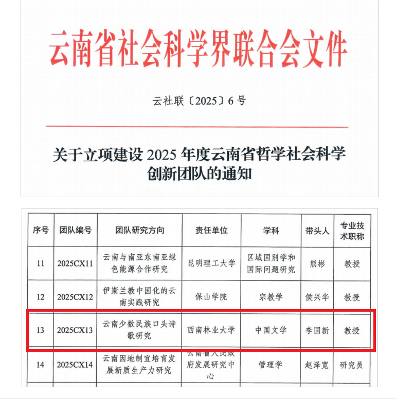近日,云南省社会科学界联合会发布“2025年度云南省哲学社会科学创新团队立项团队名单”。文法学院李国新教授负责申报的“云南少数民族口头诗歌研究”创新团队获立项,成为今年全省20个创新团队之一,也是我校获得的第7个创新团队。