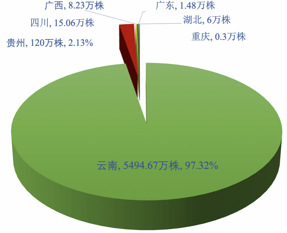 2025年,全国古茶树共有5645.74万株(含树龄不足百年的野生型茶树),主要分布在云南、贵州、广西、重庆、四川、广东、湖北等地,其中占比最高的是云南省,云南总计5494.67万株(含树龄不足百年的野生型茶树),占97.32%;贵州分布着120万株,在我国古茶树数量的占比为2.13%;四川分布着15.06万株,占0.27%;广西分布着8.23万株,占0.15%,湖北分布有6万株,占0.11%;广东分布有1.48万株,占0.03%,重庆分布着0.3万株。