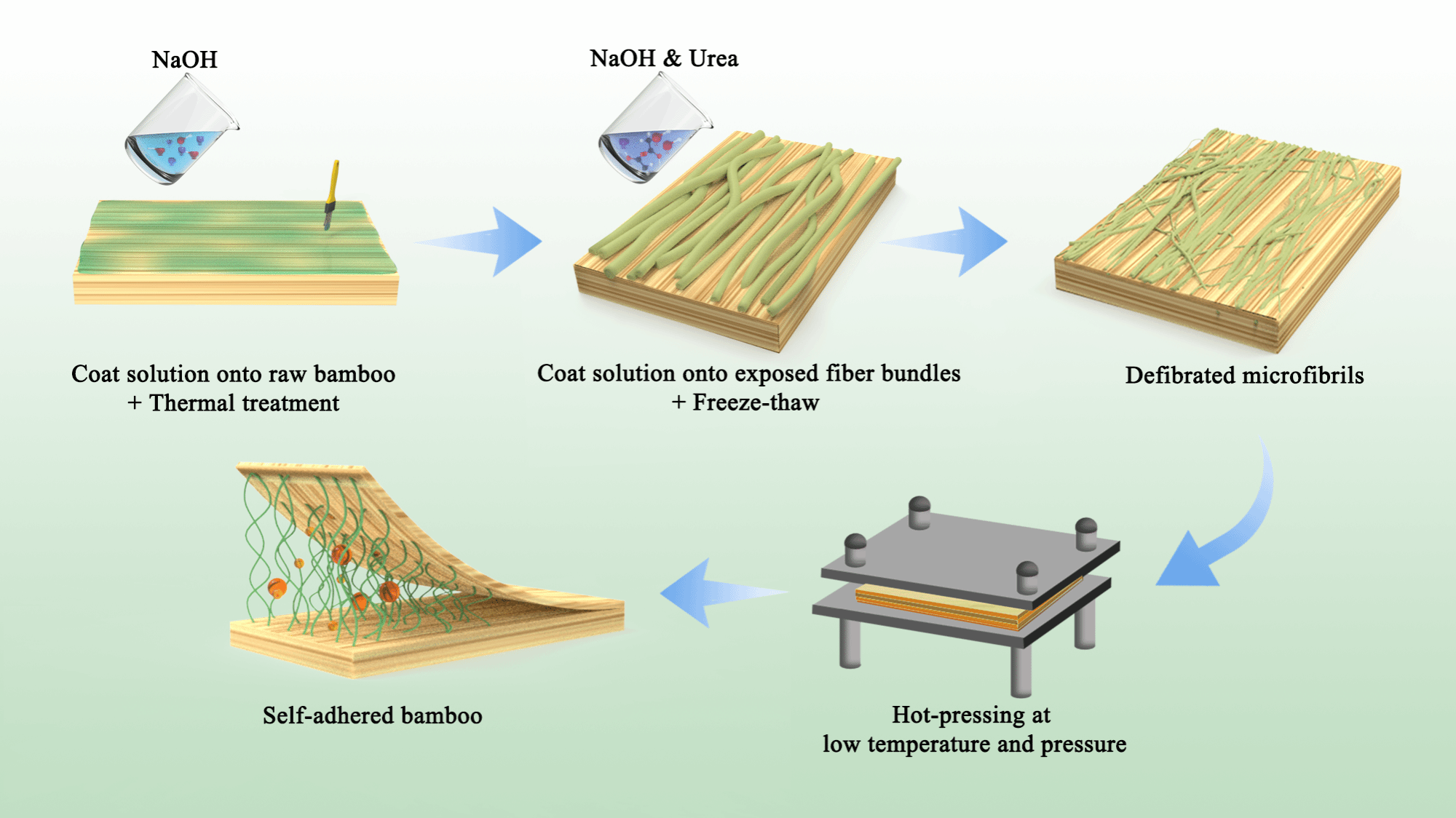研究团队针对现有木材自粘合技术所需制备条件苛刻,改性过程破坏木材天然属性等难题。创新性地通过对木材浅表层的改性处理,让竹材浅表层布满自身裂解的微纤丝,通过热压使微纤丝缠绕,同时微纤丝表面的木质素提供了辅助的粘合力,由此实现竹材的无胶自粘合。该研究的工艺过程如下图。
