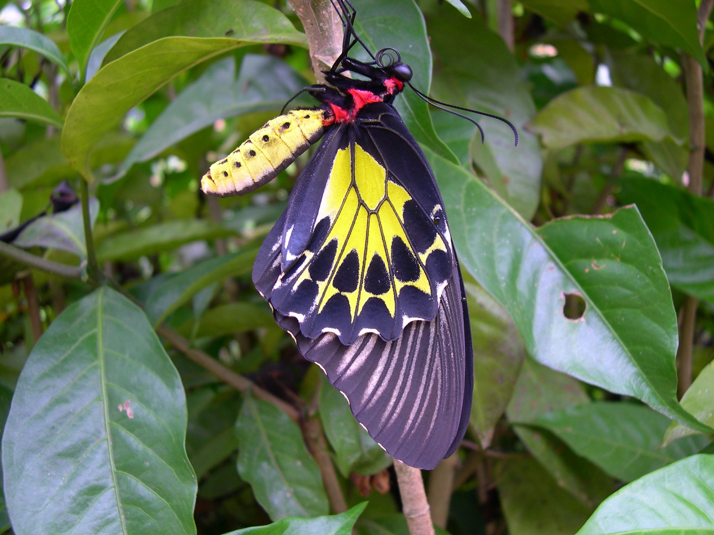 裳凤蝶,作为凤蝶科裳凤蝶属动物,体态优美,色彩艳丽。成虫中,雌蝶体长47至52毫米,翅展120至140毫米;雄蝶体长45至50毫米,翅展110至130毫米 。其触角、头部和胸部为黑色,头、胸侧边伴有红色绒毛。雌蝶前翅呈黑色或褐色,后翅中室及其周围亚外缘区各室的弯月斑为金黄色,其余部分黑色;雄蝶前翅黑色略透明,各翅脉两侧为白色,后翅则为金黄色,在外缘区有黑色三角斑 。裳凤蝶分布广泛,涵盖印度、马来西亚、新几内亚以及中国等地,在我国主要分布于云南、海南、广东、广西、香港等地。它们生活在海拔0至2200米的多种环境中,包括湿润的常绿落叶林、次生林、常绿混交林和竹林、淡水湿地等。其寄主为马兜铃属植物,在生态系统中,既具有观赏价值,又能帮助植物传播花粉,有着重要的生态意义 。