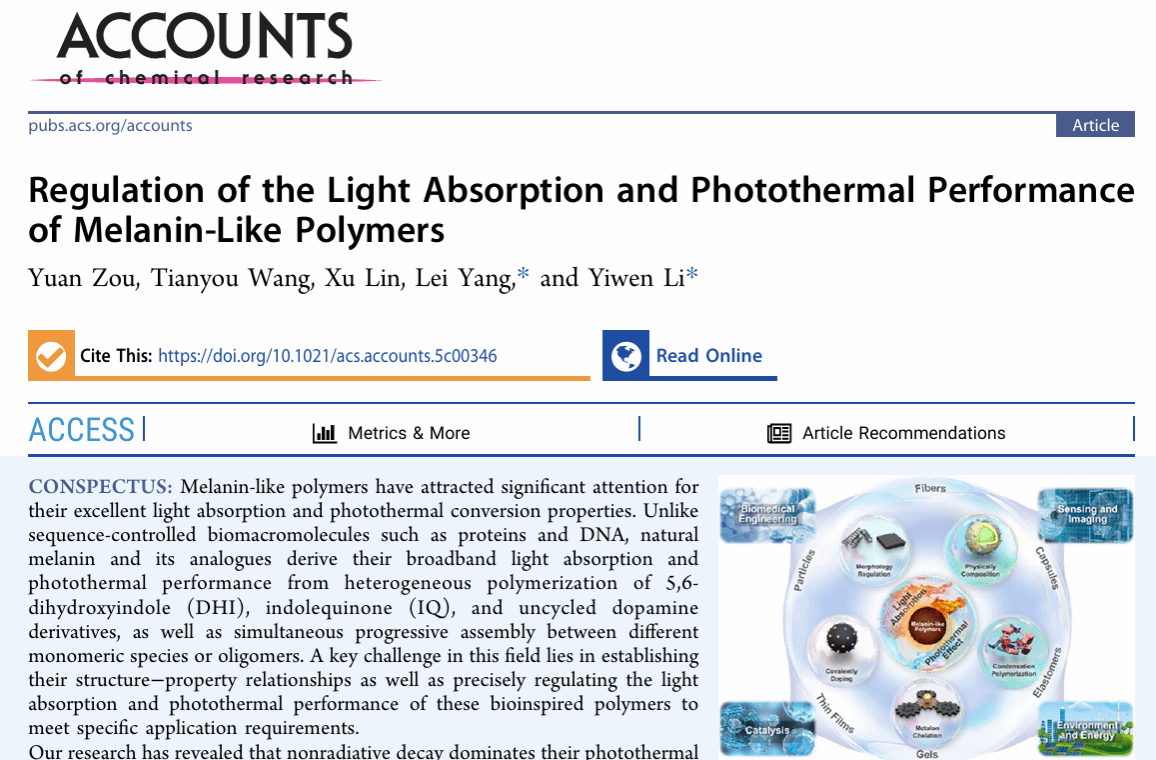 近日,bwin必赢唯一官方网站材料与化学工程学院作为第一单位,邹元老师作为第一作者,受邀于国际化学领域顶级期刊Accounts of Chemical Research上以封面论文形式发表重要综述,题为《Regulation of the Light Absorption and Photothermal Performance of Melanin-Like Polymers》。该期刊隶属于中国科学院化学1区TOP,影响因子IF=17.7。该刊仅邀请在某一研究方向取得突出成就、并形成体系性工作的国际领军学者撰稿,以呈现其课题组多年来的研究思路与重大进展。