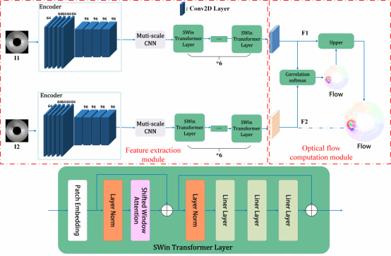 图1,网络架构概览。网络模型由特征提取模块和光流计算模块两个模块组成。Correlation softmax为相关度计算模块。I1,I2为输入的前后两组观测数据,F1和F2分别为I1和I2提取到的高维特征图,Flow是计算得到的光流。其中Encoder、Muti-scale CNN和SWin Transformer Layer模块均共享权重。