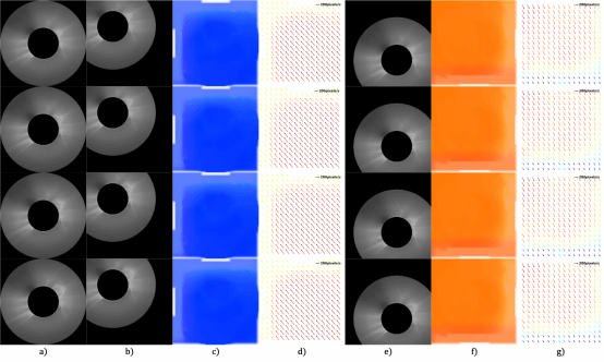 图2,在模拟位移数据集上的结果可视化。a) 输入的第一组数据,b) 输入的第二组数据;c) 计算得到的位移场稠密可视化;d) 计算得到的位移场稀疏可视化;e) 更改移动的方向和距离的输入数据;f) 是e)相当于a)计算得到的稠密光流可视化;g) 是e)相当于a)计算得到的稀疏光流可视化。