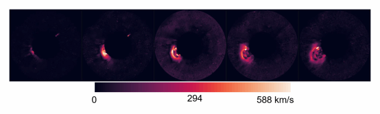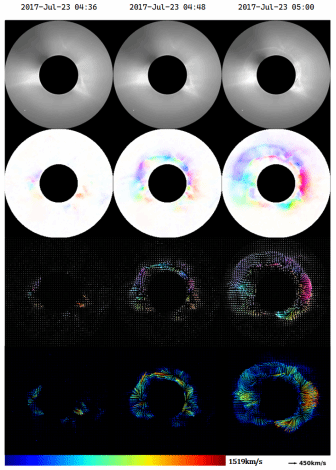 图3,连续光流速度场,CME速度场的伪彩色图显示。从图中可以明显看出冕流结构在向外喷发过程中的速度变化以及不同区域之间的速度差异。速度的快慢一般和受力的大小呈正相关,该成果可以直接为太阳物理的研究提供研究数据。