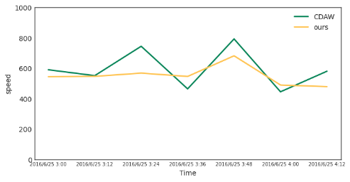 图5,通过光流计算最高点速度与国际通用的手工标注CDAW目录之间速度的比较。本文使用自注意力的无监督光流网络提取的速度场速度与手工标注的目录之间差异较小,计算得到的速度处于人工标注的速度区间,且比CDAW标注的速度变化更加平滑,符合CME喷发过程中的物理特征,验证了使用本文提出的自注意力无监督光流网络比手工特征提取更加准确。进一步,论文方法在模拟数据集中,验证了提出方法的效果均优于已有的传统方法和基于深度学习的无监督方法。