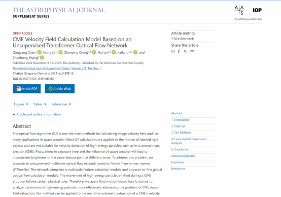 近日,强振平教授团队在《The Astrophysical Journal Supplement Series》(ApJS,中国科学院一区TOP期刊,IF=8.5)发表题为“CME Velocity Field Calculation Model Based on an Unsupervised Transformer Optical Flow Network”的研究性文章。论文第一作者为大数据与智能工程学院2021级硕士生陈清洋,强振平教授为论文通讯作者。本次发表的论文提出了一种针对天文数据的处理方法。