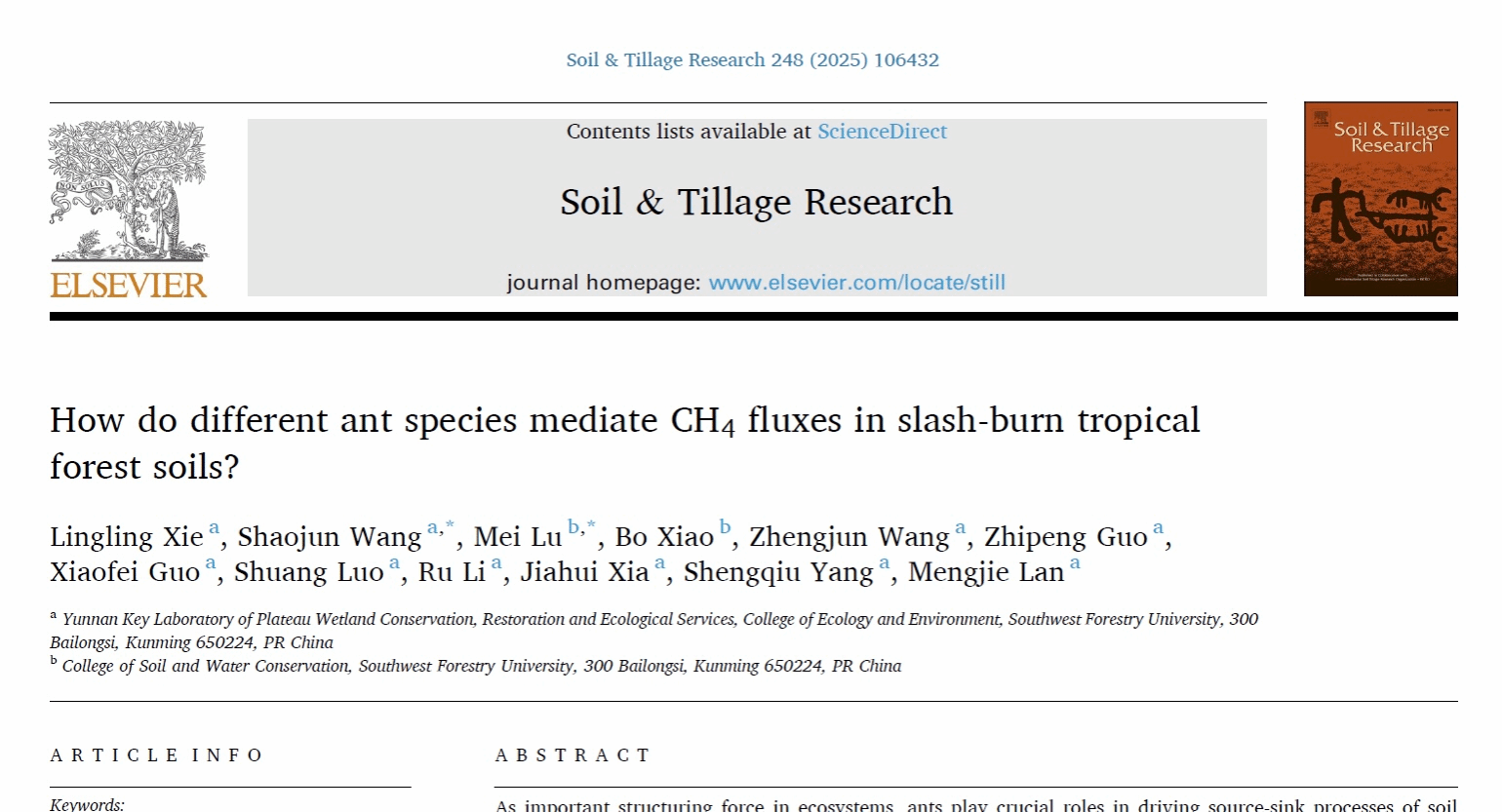 12月25日,bwin必赢唯一官方网站王邵军全球变化研究团队在国际知名期刊Soil & Tillage Research(中科院一区TOP期刊,IF=6.9)上网络首发了题为 "How do different ant species mediate CH4 fluxes in slash-burn tropical forest soils?" 的研究论文。此论文以生态与环境学院生态学专业2021级硕士研究生解玲玲为第一作者、bwin必赢唯一官方网站生态与环境学院王邵军教授为通讯作者等作者共同完成,该研究首次揭示了“土壤大型动物(蚂蚁)-土壤甲烷功能微生物-土壤CH4排放”之间的耦合过程及机制。