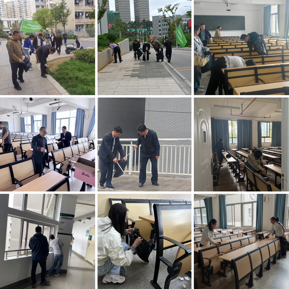 在至信楼、至真楼、西林桥等区域,职能部门广大党员、教职工认真清扫落叶、垃圾、纸屑、烟头等,以实际行动树立人人讲文明、处处见新风的良好风尚。