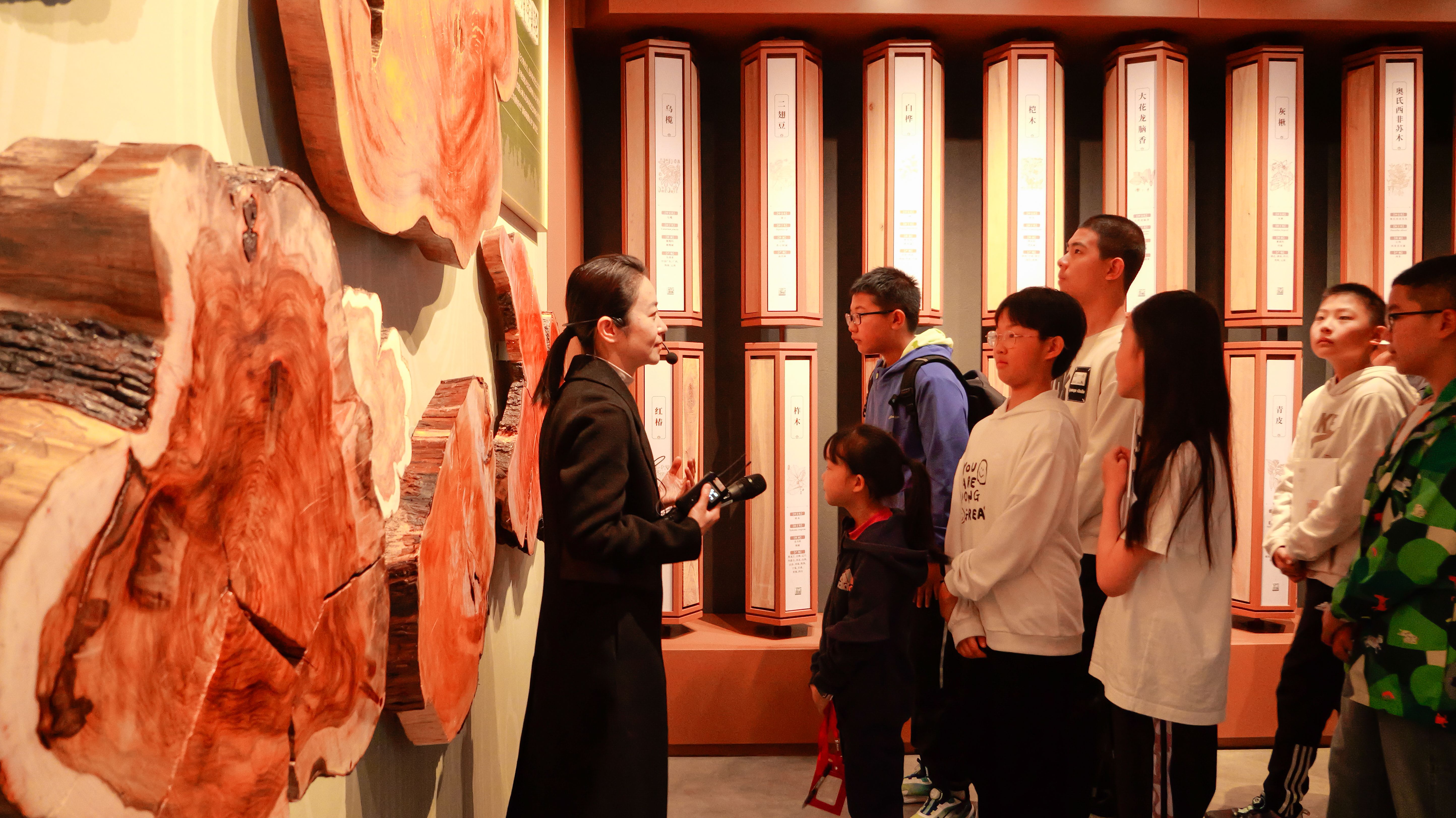 在博物馆专业讲解员的引导下,研学团依次参观了木世界展厅与竹世界展厅。在木世界展厅,“滇材大用”展区陈列的“三松一杉”等云南特色经济树种引起了同学们的关注。大家亲手掂量了极轻的“轻木”与极重的“蚬木”,直观感受木材密度的差异。此外,记录气候变迁的“年轮展墙”、具有数千年历史的“剑川海门口遗址饱水木构件”以及亿万年形成的“木化石”,使同学们深入理解了木材作为“自然档案”的重要科学价值。