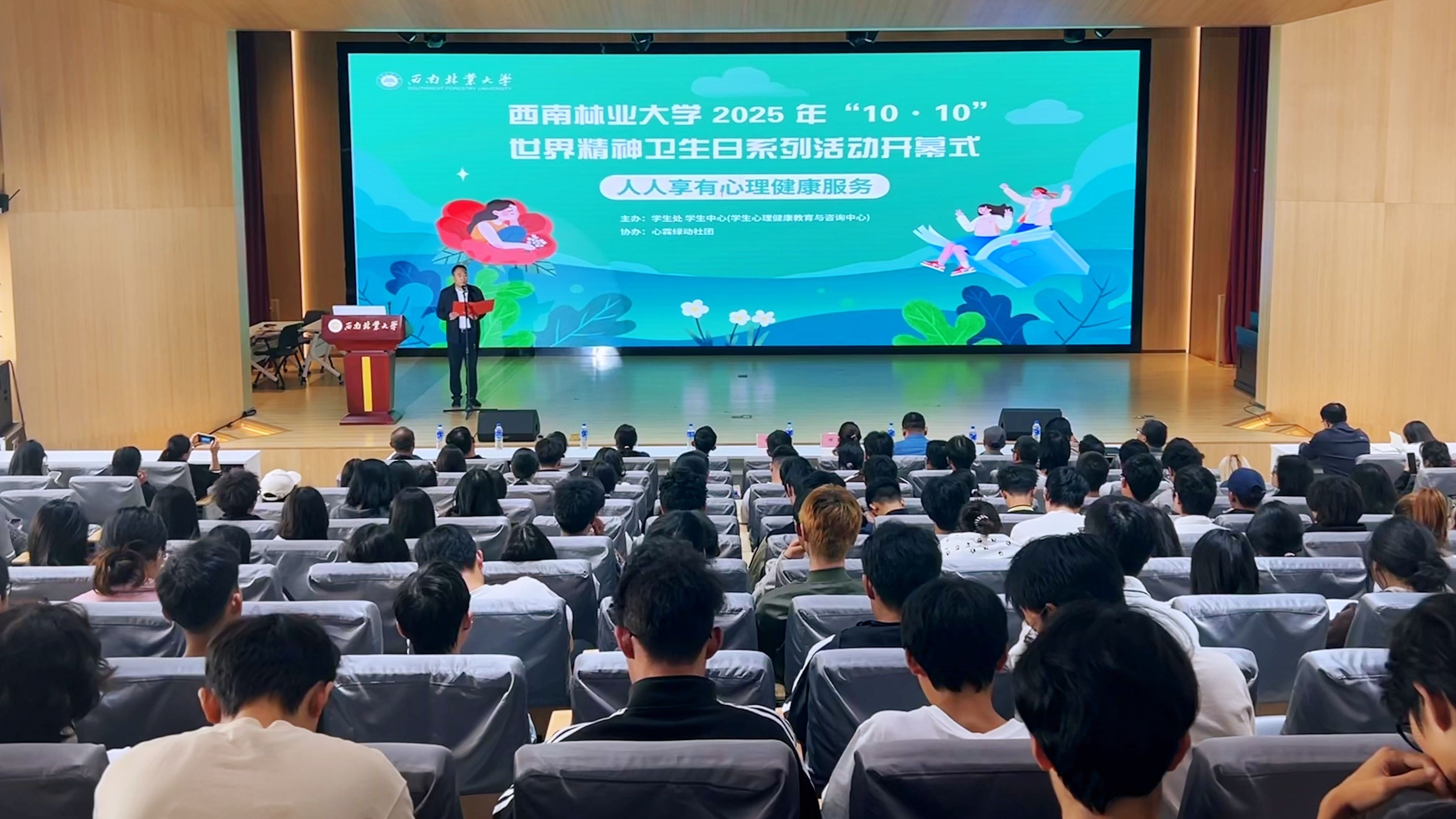 10月9日,我校于北图书馆大报告厅举行以“人人享有心理健康服务”为主题的2025年世界精神卫生日系列活动开幕式。副校长郭华及各学院党委副书记、辅导员及学生代表共350余人参加活动。