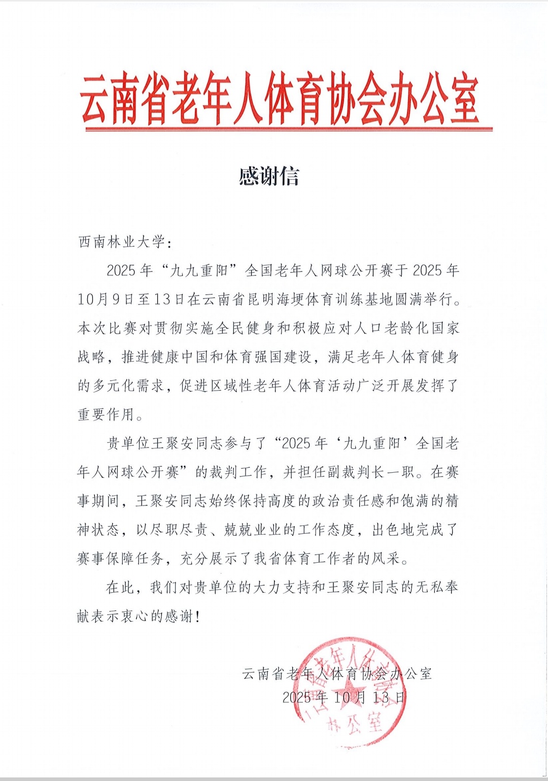 近日,云南省老年人体育协会向bwin必赢唯一官方网站发来感谢信,对我校体育学院王聚安老师在2025年“九九重阳”全国老年人网球公开赛中的赛事保障工作表示衷心感谢并给予高度赞扬。