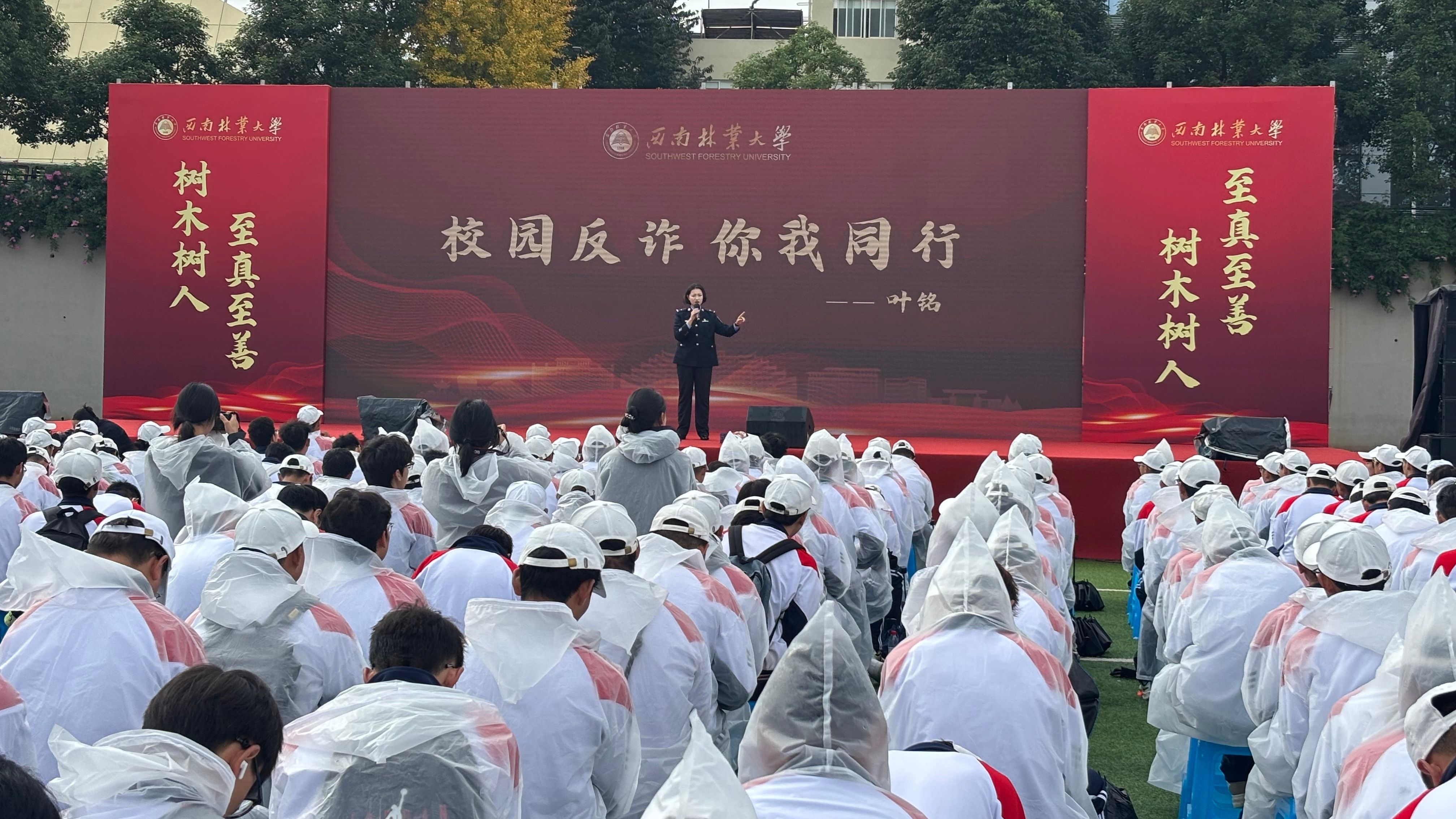 10月17日,在2025级新生军训期间,我校邀请昆明市公安局盘龙区反诈中心民警毛林飞、盘龙分局金沙派出所民警叶铭为全体参训新生举办了以“校园反诈,你我同行”为主题的防范电信网络诈骗专题宣讲会。