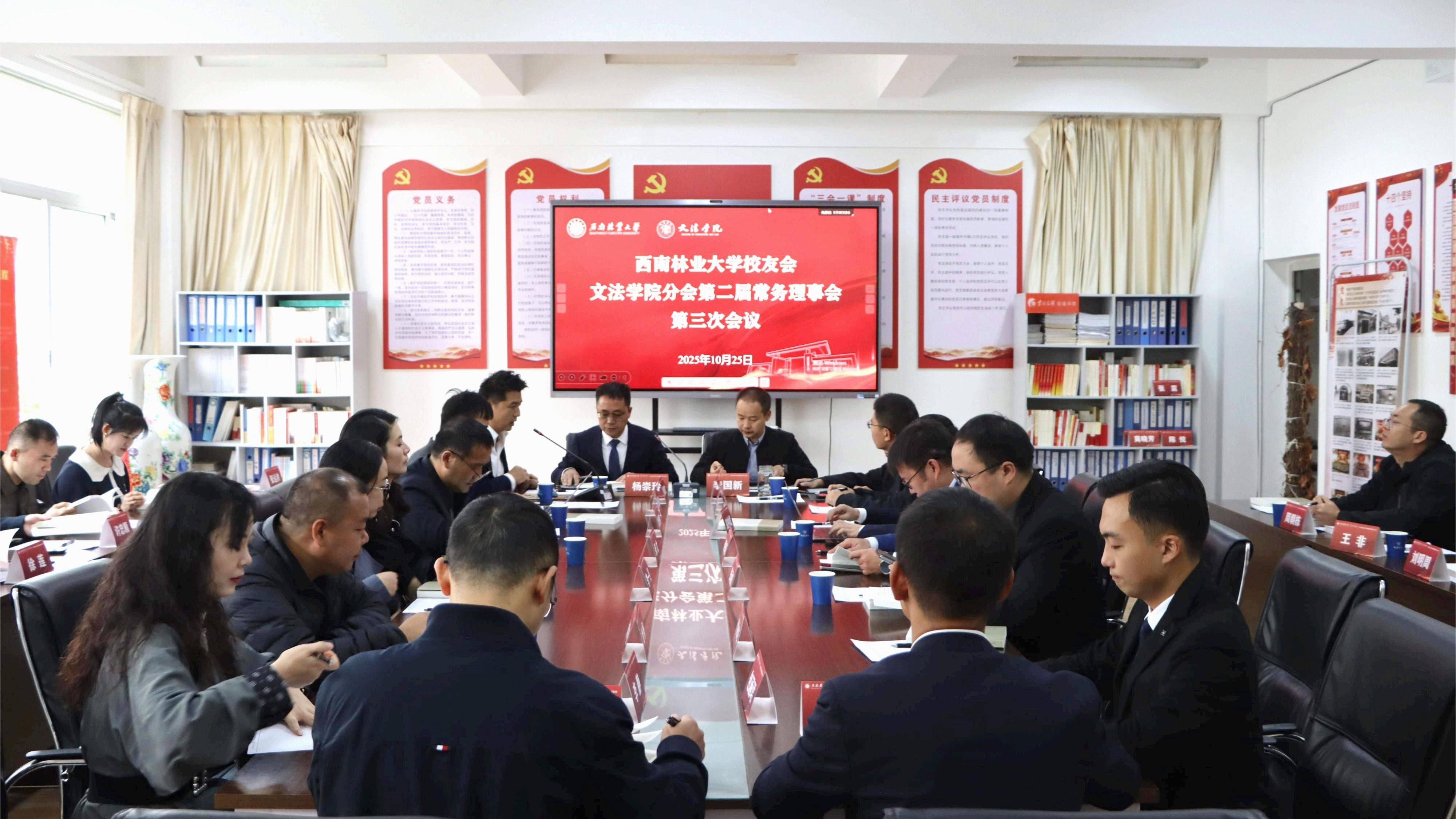 揭牌仪式后,学校校友会文法学院分会召开第二届常务理事会第三次会议。会议审议并通过了副会长、常务理事及理事的增补名单,专题研讨了2026年法学专业办学30周年纪念活动的策划方案,并一致表决通过了新任执行会长的人选。(来源:文法学院/图:孟庆鹏/文:刘砾,郭政达/审核:张译文/初审:张凡/复审:冷瑾,张冉/终审:张卓亚,柏顺文/责任编辑:张凡)