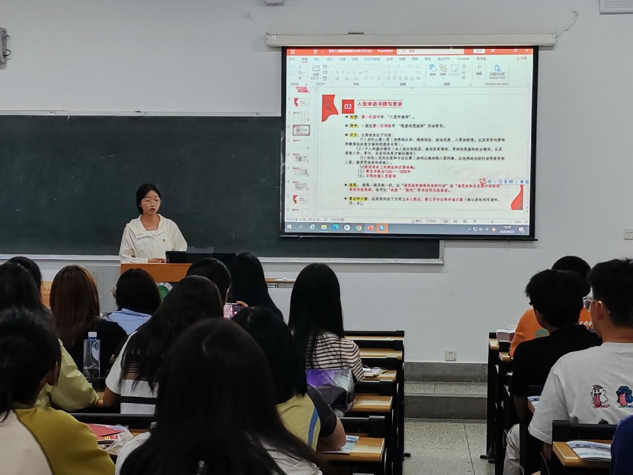 宣讲员为新生们生动讲述了党的发展史及奋斗史,让同学们深刻认识到中国共产党人的理想信念、革命意志和政治品格,讲解了发展党员工作流程和如何端正入党动机的相关内容。
